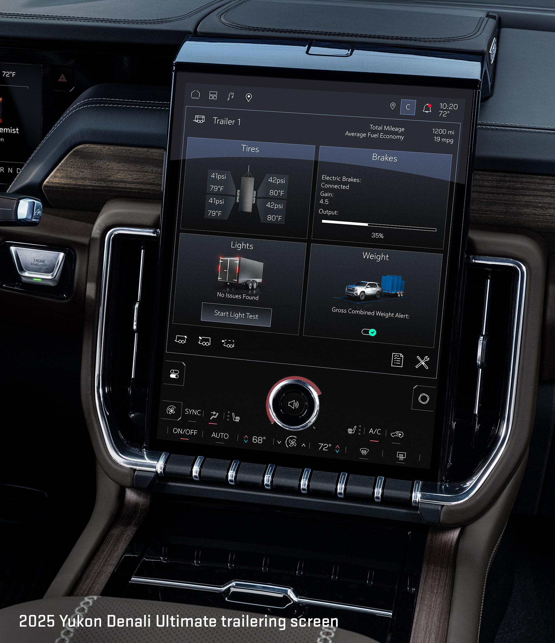 The available In-Vehicle Trailering App1,2 — standard on Sierra AT4/AT4X, Denali/Denali Ultimate and available on Yukon AT4 Ultimate and Denali Ultimate — offers a smart approach to towing with integrated tools. You can access the app through the trailering icon on the vehicle’s center display.